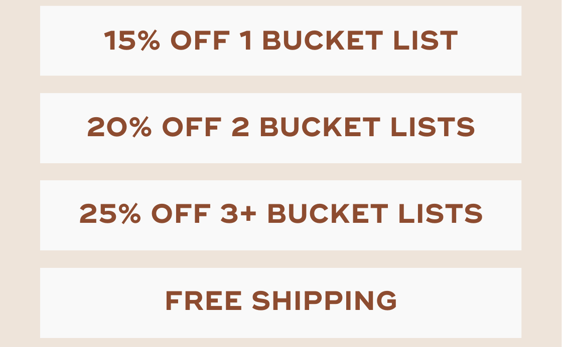 And when you're ready for more, our Adventure Bucket Lists give you 50 scratch-off ideas to keep your weekends fresh all season long. Use code ENDOFSUMMER15 at checkout for: | | OUR ADVENTURE BUCKET LISTS | | | | |