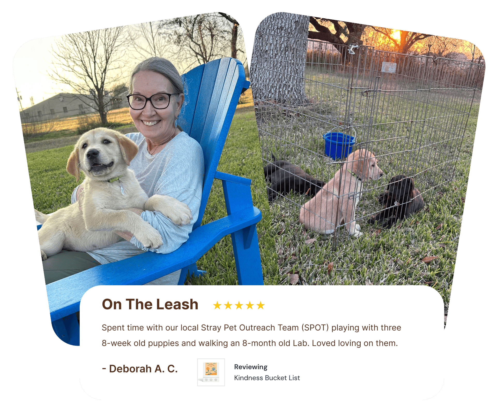 10% off for a limited time! | | Deborah embarked on a kindness adventure which led her to spend time with local stray dogs. A great way for the puppies to feel loved and to spread joy. | | Deborah embarked on a kindness adventure which led her to spend time with local stray dogs. A great way for the puppies to feel loved and to spread joy. |