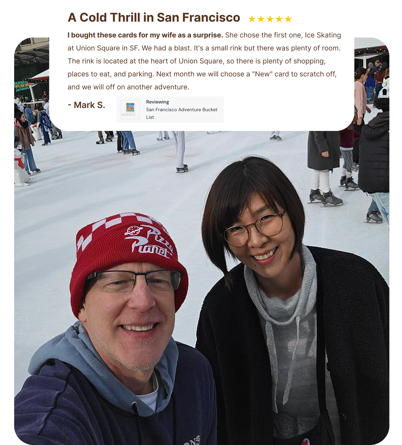 This person used their bucket list as a surprise gift, which led to an ice skating date in the park. Shared memories together are what our bucket lists are all about. | | | | |