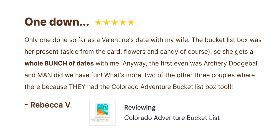 One of our favorite ways people use our bucket lists: Date Night. Hear from how other couples used our bucket lists to make an Adventure out of date night. | | One of our favorite ways people use our bucket lists: Date Night. Hear from how other couples used our bucket lists to make an Adventure out of date night. |